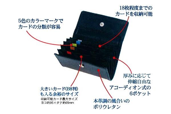 | 約18枚程度のカードが収納可能。B8判のカードも入る余裕のサイズ!カラーマーク付きで分類しやすいアコーディオン式カードホルダー。 |