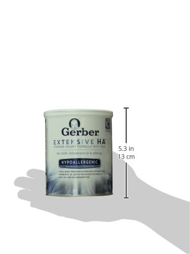 -. Binding : Grocery -. Brand : Gerber Good Start Infant Formula -. EAN : 0050000598526 -. Feature : 14.1 Ounce container - Makes 96 fluid ounces reconstituted infant formula (24 - 4 fl oz bottles) / Hypoallergenic formula designed for babies with cow's protein allergy with all essential nutrients including calcium and iron,for adE.q.u.a.t.e growth. With expert recommended DHA for brain and eye development. / Made with 100% high quality whey protein, that has been extensively broken down to make the formula hypoallergenic and well tolerated / Has the probiotic B. lactis, to help promote a balance of beneficial bacteria to support baby's digestive health / Gerber is a leader in infant and early childhood nutrition. Have questions? We are awake when you are 24/7: 1-800-284-9488 -. IsAdultProduct : 0 -. Label : Gerber -. Manufacturer : Gerber -. Model : VBPUKALIZINW556 -. MPN : 12263297 -. NumberOfItems : 1 -. PackageQuantity : 1 -. PartNumber : 12263297 -. ProductGroup : Grocery -. ProductTypeName : GROCERY -. PublicationDate : 2015-03-23 -. Publisher : Gerber -. ReleaseDate : 2015-03-23 -. Size : 14.1 fluid ounce -. Studio : Gerber -. Title : Gerber Extensive HA Hypoallergenic Powder Infant Formula with Iron, 14.1 Ounce -. UPC : 050000598526