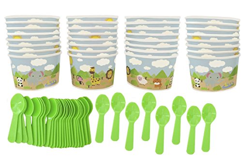 Product Description Go wild with 4oz. Safari printed paper frozen yogurt cups. This fun, kid friendly design is sure to grab attention and entertain. These 4oz cups are perfect for storing hot or cold foods, snack items and small meals such as ice cream, yogurt, gelato, crackers, and fruit. All frozen yogurt cups/containers feature a double poly lining for added resilience and to prevent leaking. We have added 32 adorable little green spoons as well. 0