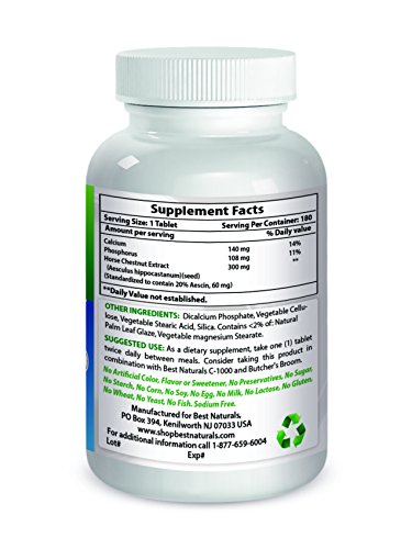 -. Binding : Health and Beauty -. Brand : Best Naturals -. EAN : 0772195092046 -. Feature : Circulatory Support* / Supports fluid balance in legs / Supports integrity of the veins and capiilaries / Standardized to contain 20% Aescin / All Best Naturals products are manufactured in accordance with Good Manufacturing Practices (GMP), among the highest standards in the world -- Proudly Made in USA -- Purity & Potency Guaranteed -. IsAdultProduct : 0 -. Label : Best Naturals -. Manufacturer : Best Naturals -. MPN : 614444 -. PackageQuantity : 1 -. PartNumber : 614444 -. ProductGroup : Health and Beauty -. ProductTypeName : HEALTH_PERSONAL_CARE -. Publisher : Best Naturals -. Studio : Best Naturals -. Title : Best Naturals Horse Chestnut Extract 300 mg 180 Tablets -. UPC : 772195092046