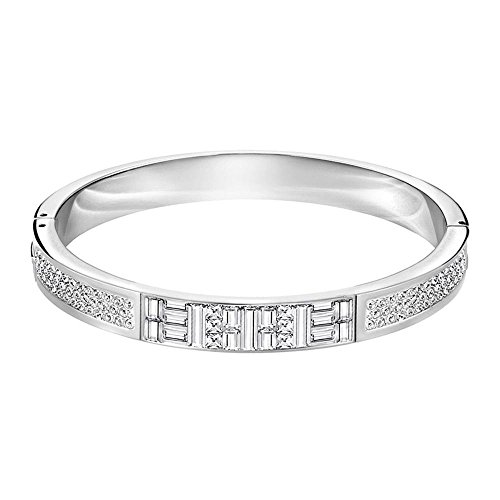 Wear this Swarovski bangle for a chic, sleek look with a modern edge. Crafted with a rhodium plating, this bangle features a unique blend of baguette and round clear crystals adding a geometric twist for a dose of drama. This bangle can be worn by itself or stacked easily with other pieces to keep your style on point. The oval shaped bracelet measures 2 1/4 x 2 inches in diameter.Feature