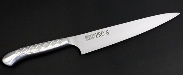 PRO・Sシリーズのペティーナイフは、家庭からプロまで広く愛用される包丁です。人間工学に基づいたデザインで、長時間の使用にも疲れにくい、丸みのある人に優しいフォルムが特徴。刃からハンドルにかけて、流れるようなラインを生み出し、一体感のある形に仕上がっています。ステンレス一体型は、日本刀の模様のイメージのスリットが滑り止めの役割を果たします。 |