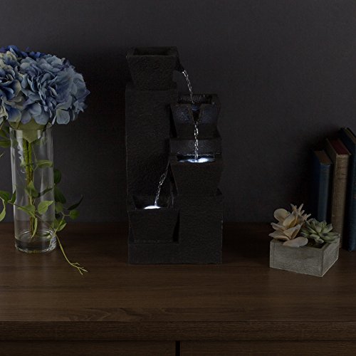 - UNIQUE DÉCOR WITH LED LIGHTING- This 4 tiered fountain is truly an ideal blend of modern design, zen elements, and simple charm, and it offers the tranquil and meditative sounds of running waters for a calming ambiance. The fountain is lit by LED lights to help to illuminate the waters and offer a peaceful, relaxing glow. With the water gently cascading over the artistically fashioned tiers, the water fountain is sure to be a vivid focal point in your bedroom, living room, home, office or even outdoors on a table on your patio!