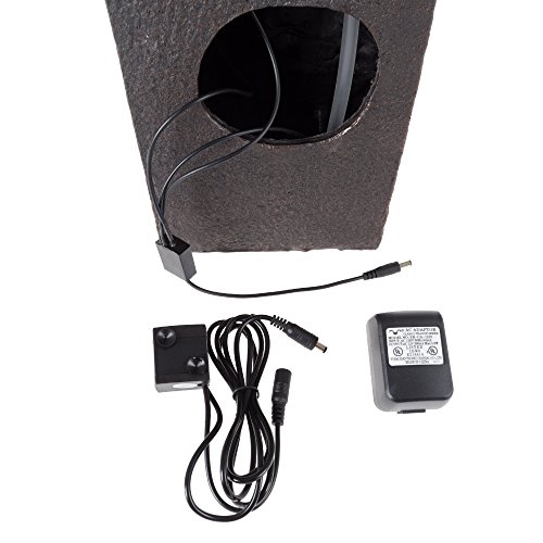 - PRODUCT DETAILS - Fountain dimensions: 15.25” H x 7” W x 6.25” L. Material: Polyresin. Weatherproof. Pump Included. Adjustable Valve. Voltage: 120V. Wattage: 2W. Certifications and Listings: UL. Prelit: 3 LED lights. Cord Length: 59”