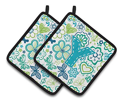 Caroline's Treasures Letter Y Flowers & Butterflies Teal Blue Pair of Pot Holders CJ2006-YPTHD, 7.5HX7.5W, Multicolor