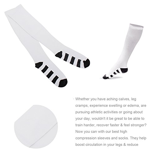 -. Feature : Whether you have aching calves, leg cramps,experience swelling or edema, are pursuing athletic activities or going about your day,wouldn't it be great to be able to train harder,recover faster&feel stronger?Now you can with our best high compression sleeves and socks,They help boost circulation in your legs &reduce the risk of injury. / The sleeves are beneficial for running,hiking,martial arts,cross fit,volleyball,basketball,cycling,baseball,work outs or any fitness activities.Whether high or low or high impact,these enable you to warm up safely and recover quickly.Or to even cover up a tattoo! / The compression leg socks are moisture wicking, ensuring they stay dry and lightweight even during the toughest runs and workouts. / US Size) S/M: Women shoes size 6-7, Men shoes size 7.8-8.5,L/XL: Women shoes size 7-8, Men shoes size 7.5-8.5 / Light weight and portable.