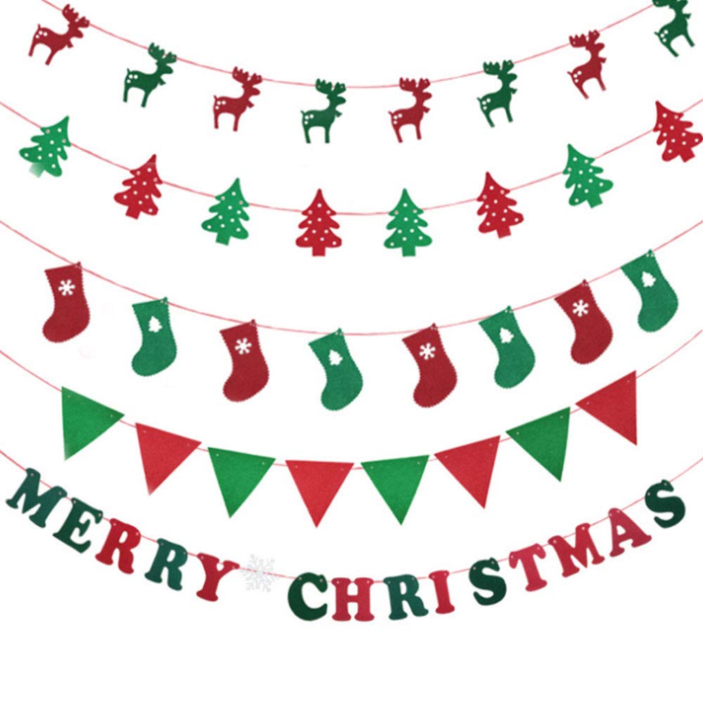 【5点セットお得】トナカイ+クリスマスツリー+靴下+三角旗+MERRY CHRISTMAS文字の5点セットなので、自由に組み合わせて、楽しくデコレーションできます。 【雰囲気を盛り上げ】グリーンとレッドでクリスマスらしさ満点!クリスマス気分を盛り上げに必須アイテムのガーランドです。子供と一緒にクリスマスの面白さを楽しめます。 【飾り付けやすい】紐を引っ張るだけで簡単に装飾でき、後片付けも楽々です。壁に貼り付けたり、吊るしたりしてクリスマスを盛り上げましょう! 【様々な場所に適用】クリスマスパーティー、イベント、店の飾り、写真の背景など様々な所でご活用頂けます。使い方色々、おしゃれで可愛いインテリアです。 【ガーランドについて】素材:不織布 全長:約3M フラッグサイズ:約20cm*15cm ※フラッグの穴に付属の紐を通して飾ってください。