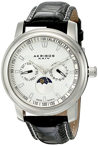 -. Title : Akribos XXIV Men's AK573SS Ultimate Swiss Quartz Multifunction White Dial Stainless Steel Black Leather Strap Watch