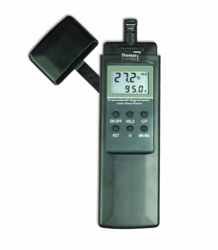 -. Binding : Misc. -. Brand : Thomas -. Feature : Fast response time / Minimum/maximum for all readings / Humidity, dew point and temperature display / Compact design features an electronic capacitance polymer film sensor not affected by condensation / Measures 2" width by 6.5" height by 2/3" thick -. IsAdultProduct : 0 -. Label : Thomas Scientific -. Manufacturer : Thomas Scientific -. Model : 4392 -. MPN : 4392 -. NumberOfItems : 1 -. PackageQuantity : 1 -. PartNumber : 4392 -. ProductGroup : BISS -. ProductTypeName : LAB_SUPPLY -. Publisher : Thomas Scientific -. Studio : Thomas Scientific -. Title : Thomas Traceable Pocket Dew Point/Hygrometer/Thermometer, -4 to 122 degree F