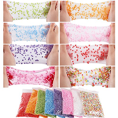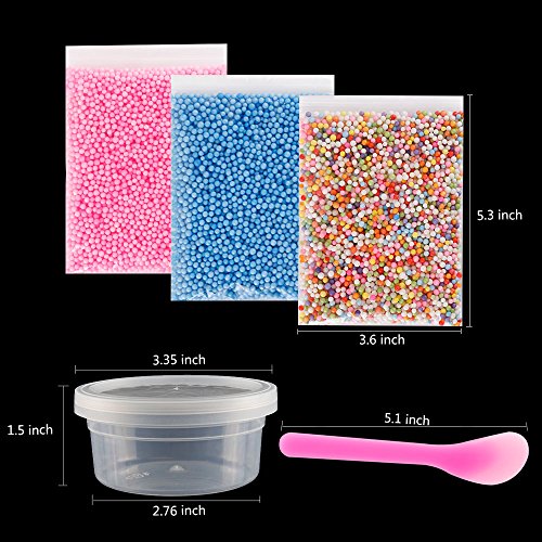 - Slime-making kit: comes with 8 pack different color foam beads (purple, blue, red ,pink, white, orange and mixed color), 5 pieces clear Slime containers 4.5oz with corresponding fit lids, 5 pieces slime mixing spoons