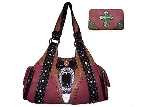 -. Title : Western Rhinestone Cross Buckle Style Handbag Purse with Magnetic Closure and Matching Wallet 5238 in Black, Brown Red and Pink