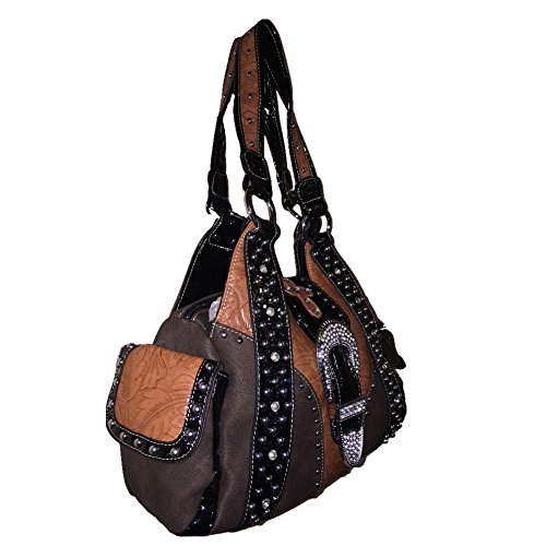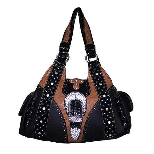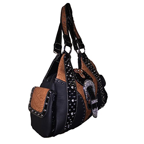 -. Feature : Western Style Chic! An oversize rhinestone encrusted buckle and rhinestones cross on buckle design give this bag beautiful BLING! Measures approximately 12"W x 8"H x 4.5"D- not too big, not too small / zippers access- safe way to carry and convenient to use. Side pockets are ideal for carrying things you use most / Lined interior has 2 roomy compartments separated by a center zipper compartment- plenty of room for the things you just can't do without. Cellphone pocket and Wallet pocket are inside too / 2 wall pouch pockets great for keeping your keys, pens, etc. and two back wall zipper pockets make great place to put your lipstick, ID, etc. / Extra rhinestones included. An open pocket on the back is a great place to keep your cell phone- no more missed calls. We also offer the super fast handling and shipping.Matching wallet is an option for sale together with purse.