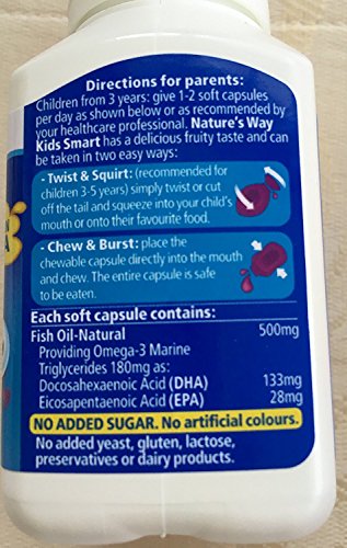 Nature's Way Kids Smart Fish Oil is specifically formulated to assist in providing children with essential Omega-3 nutrients DHA and EPA. This blend of Omega-3 Fish Oil may assist, support and maintain healthy brain function, healthy behaviour, learning, eye health, healthy temperament and healthy nervous systemFeature