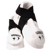 -. Feature : Toe ties and a reinforced bottom strap. / Criss-cross elastic strap with hook/loop closure. / Made in USA. / Available in White, Red, Black or Blue Metallic / Sizes Child M, L, Adult S, M, L, or XL.