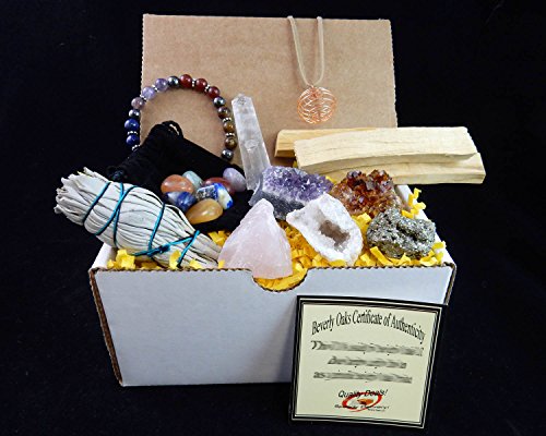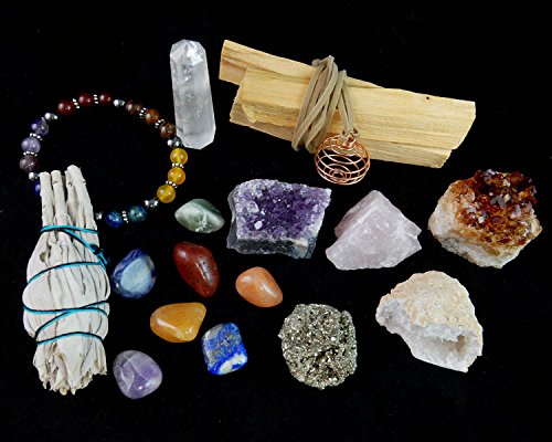 White Sage, Palo Santo Wood & Crystal Healing Kit (17Pc) ~ Smudge Stick, Palo Santo Sticks, Raw Crystals, Quartz Obelisk, 7 Chakra Stones, +Bracelet & Spiral Pendant Necklace w COA & Info Card