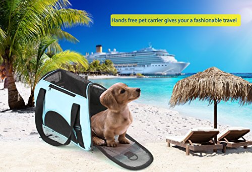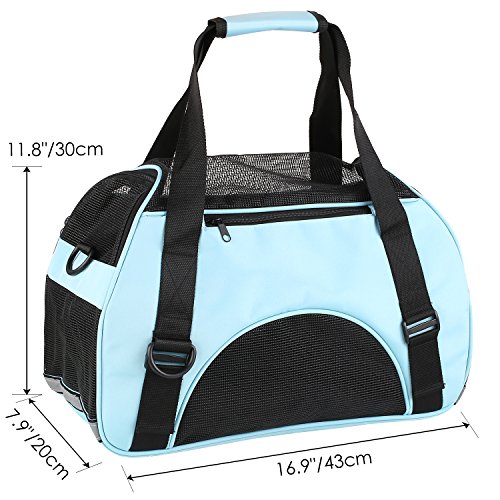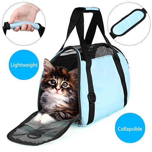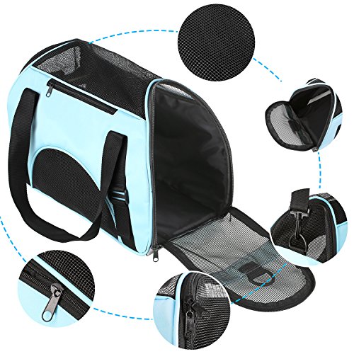This portable pet carrier is designed for your lovely pets when you want to carry them out or take a plane. With this carrier, you can carry your pet with confidence without worrying about troubles. This airline approved pet carrier can be used for carrying kittens, puppies and teacup breeds. This soft sided pet carrier is your best choice if you have kittens, puppies and teacup breeds or any other pets smaller than 8 pounds. Reinsert-able hard support PE board keeps the carrier in good shape and makes your pet feel more comfortable, and are removable for washing. Full zip opening on the both ends and added mesh panels allow maximum accessibility and ventilation for your pet. A pocket on the top gives you a place to keep essentials for your pets, such as a leash or snacks. Hand carrying straps and adjustable padded shoulder strap allow for many carrying options. This carrier is made from durable, lightweight, waterproof material, which is very easy to clean. We offer a 12 months warranty for this portable pet carrier. What are you waiting for? Add it into your cart now!
