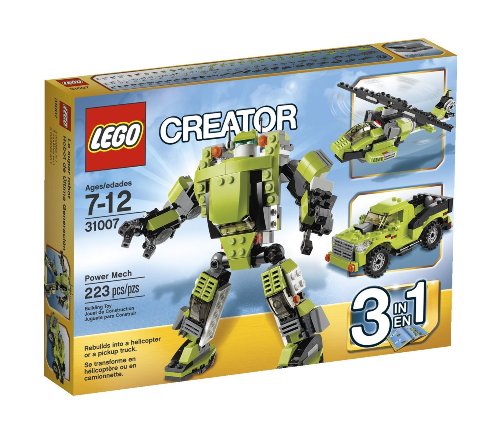 Make way for the mighty Power Mech! Suit up for futuristic battle with strong green armor, powerful arms, grabbing claws and leg-mounted boosters and launch into the sky! The Power Mech is a bright battle bot ready for anything! Move the arms and legs for realistic robot action. Then rebuild it into a fast helicopter with moving rotor or a heavy-duty pickup truck with rugged offroad tires. 7 - 12 YearsFeature