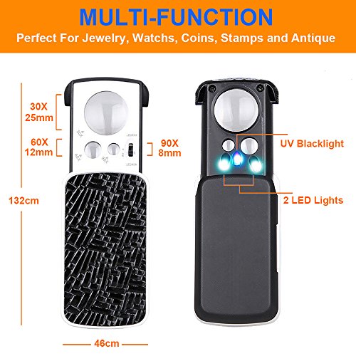 -Multi-Power Pocket magnifying glass with 3 progressively stronger magnification: 30X, 60X and 90X