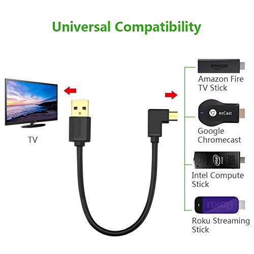-. Feature : Usage: Ugreen TV stick Power Cable is an ideal choice to eliminate the need for an AC power outlet to power your TV Stick. / Perfect Angle Design: The right-angle(90 degree)/left-angle (270 angle) and short cable desgin of this tv stick usb power cable keeps space tidy and clean. / Universal Charging: This usb power cable achieves a quickest and easyest way to power tv sticks, and can also charge your any portable devices like phones, tablets, MP3 players, power banks while travel. / Compatibility: The micro usb power cable is compatible with TV Stick, Google Chromecast, Intel Computer Stick and Roku streaming Stick and other devices with micro usb port. / Durable Connectors: With Gold plated connectors, the power cable provides maximum conductivity, charges much faster than normal cables.Please note TV stick is not included.