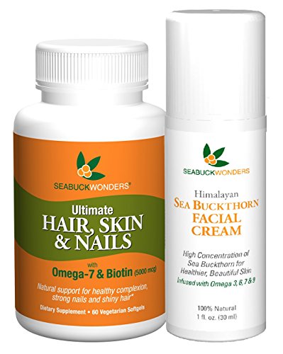 The only product to combine biotin with sea buckthorn oil for the best beauty & health support. Sea buckthorn oil's omega content nourishes and restores cellular health throughout the body. People with problem skin love the soothing effect of this supplement. Ultimate Hair, Skin and Nails creates beautiful results using the power of natural health. Omega 7 provides deep hydration and boosts skin cell functions. Omegas 3, 6 & 9 nourish and restore the natural balance of the skin. Biotin is a B vitamin that is crucial for supporting healthy functions in the body. It improves the metabolism of fatty acids and amino acids. Biotin can stop dry brittle nails, problem skin and moisturize hair that breaks. Combining sea buckthorn oil with biotin replenishes strength like no other supplement can. This product comes in a vegan gel cap.Feature