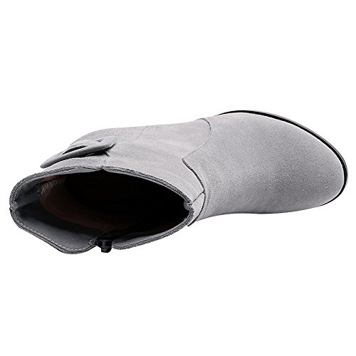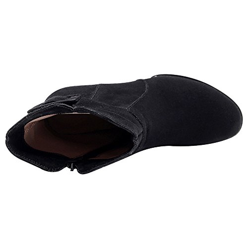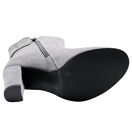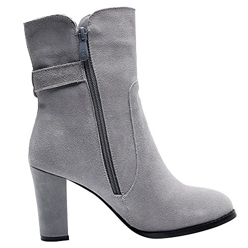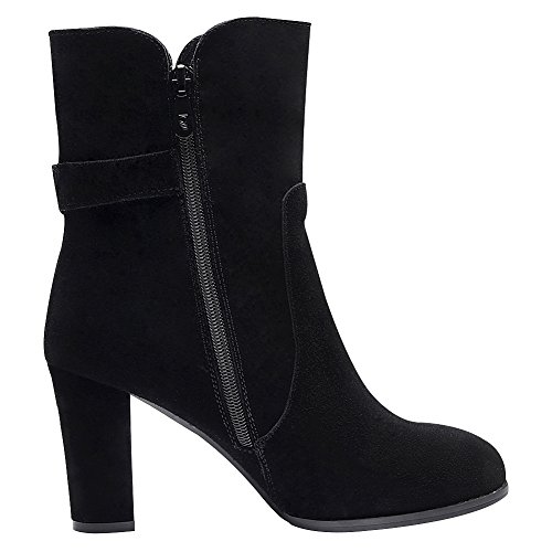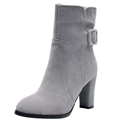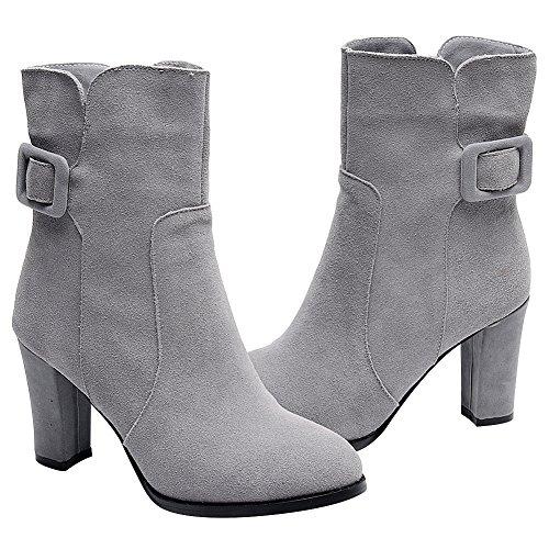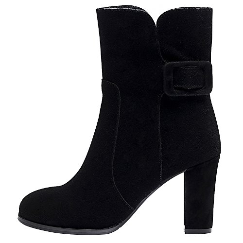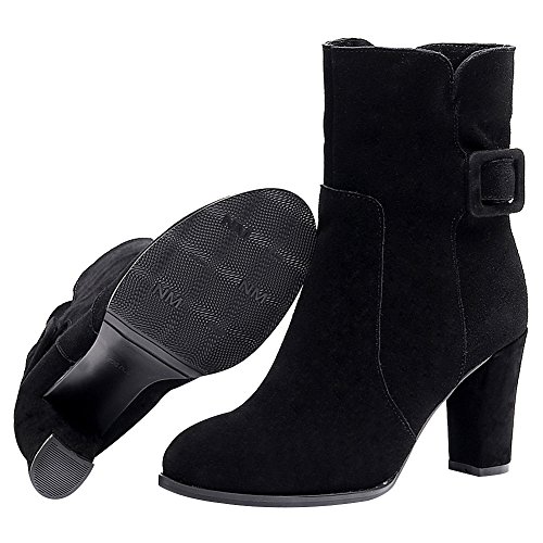 Product Description Simple design with buckle strap makes the boots look less monotonous and add a sense of fashion. Made of genuine nubuck leather which gives you the super comfort. 7cm block heel can add your height greatly but you won't feel tired walking with it. Classic winter colors--black and grey,all-match and never out of style. 0