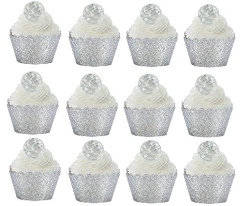 24pk Wedding / Bridal Shower /Anniversary Cupcake Toppers w Glitter Wrappers (Silver Wrappers/ ridescent Diamond Rings)
