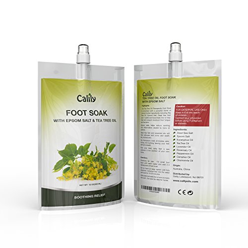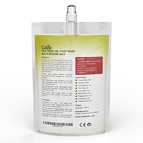 -. Feature : FINEST NATURAL INGREDIENTS - The Calily™ Tea Tree Oil Foot Soak features a powerful blend of minerals and natural oils recommended by spa professionals; including Tea Tree Oil, Epsom Salt, Dead Sea Salt and five additional essential oils. Experience a unique pampering and healing foot soak in the comfort of your own home. / CLEANS & DEODORIZES - Features natural ingredients that kill odor-causing bacteria, eliminating foot odors at its source. Get rid of smelly feet and enjoy the great feeling of having fresh, odor-free feet! / ELIMINATES BACTERIA & FUNGUS - The Calily™ foot soak's special blend features natural disinfectants and anti-fungal properties, which combats fungus and other bacteria. Helps eliminate and protect against athlete's foot, fungus and toe-nail infections. Alleviates itching and burning sensations, leaving feet rejuvenated! / SOFTENS - Packed with ingredients that amazingly softens and revitalizes the skin; soaking feet for 15-20 minutes softens the skin and helps to easily remove callouses, corns etc. Soothes dry and cracked skin. Enjoy silky soft and refreshed feet! / SOOTHES & RELAXES - Pamper yourself with a relaxing and soothing foot soak after a hard day of work. Enjoy a luxurious relaxation experience, alleviating swelling, inflammation, foot aches and pains while rejuvenating your senses with the foot soak's pleasant aroma. Soak away stress and energize your tired feet after a long day!