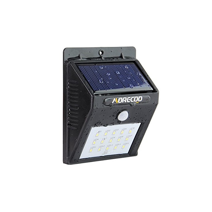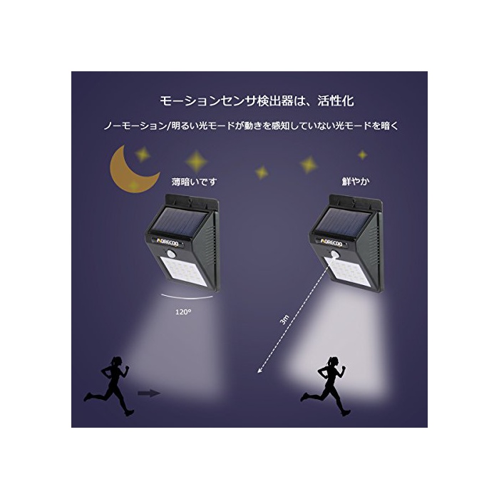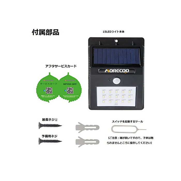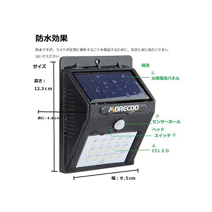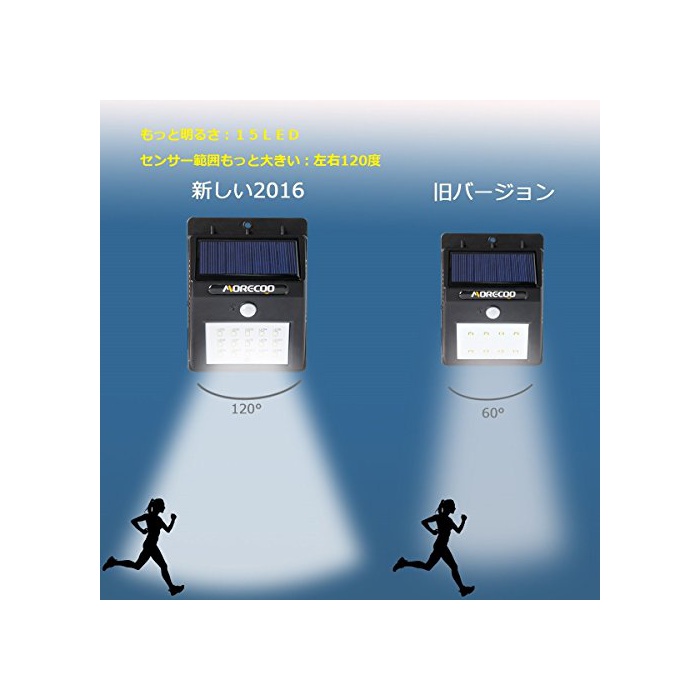 원본상품명:MORECOO ソラライト センサライト 15 LED より明るい 人感センサ 明暗センサ 夜間自動点 防犯果 屋外照明/夜間照明/軒先/壁掛け/庭先/玄の周りなどに適用 ソラ充電