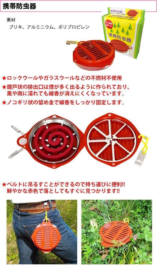| 野外での農作業や、キャンプ時の虫対策に最適な線香です。有効成分メトフルトリンにより優れた防虫効果を発揮。さらに新成分エミネンスを配合し、効力がパワーアップしました!!線香の厚みが通常の線香の1.5倍あり、煙の量が格段に違います!!専用の携帯防虫器に入れることで、突然の雨や風で消えることがなく、ベルトに吊るすことができるので持ち運びに便利♪予備の線香を入れておくこともできるので、長時間の作業でも安心です。 |