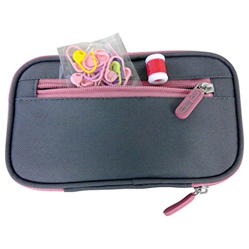 Everything comes in an 8 x 5 inch travel size, lightweight, slim, sturdy, easy to carry grey canvas organizer case with pink trim. Snips and hooks together, 20 pcs plastic marker and row counter in side zipper. Fits in any good sized handbag. Colors of plastic markers and position of snips in case may vary