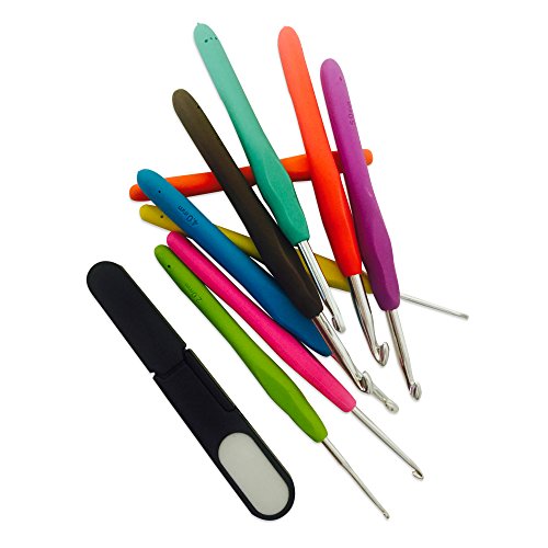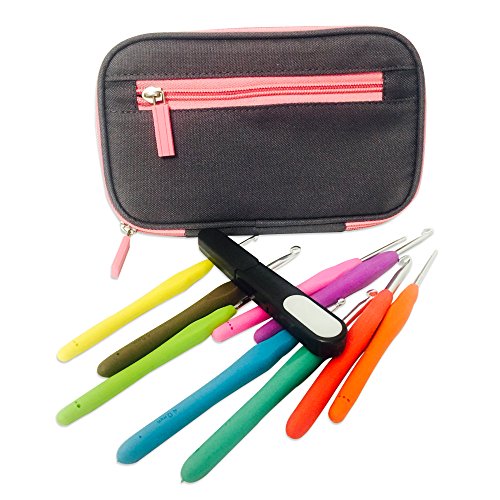 Crochet Hooks Set by Classy Catz. 9 color Soft Rubber Ergonomic Comfort Grip Handles for Pain-free Crocheting. 8 x 5 inch Canvas Case with 21 pcs Accessories.