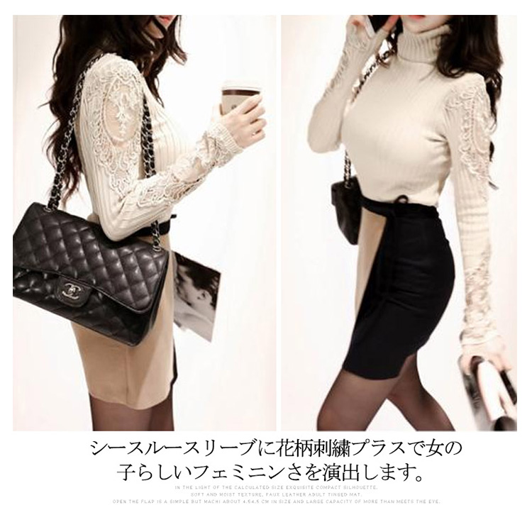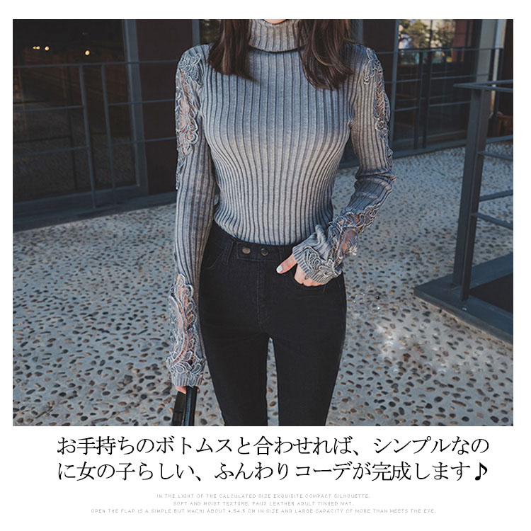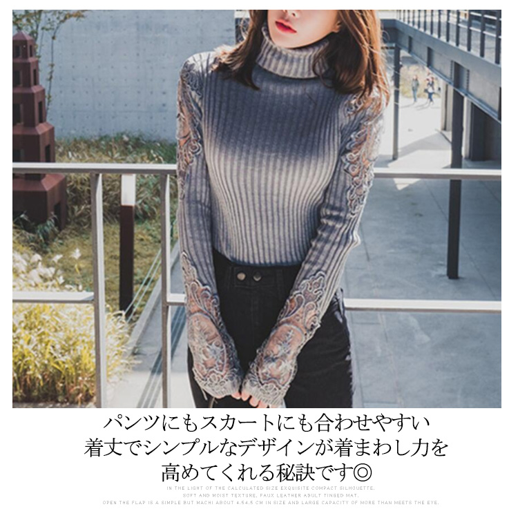 | 秋冬に向きのシンプル長袖ニットトップス。タートルネックなのでマフラーも要らず、防寒効果抜群。シースルースリーブに花柄刺繍プラスで女の子らしいフェミニンさを演出します。程度良いフィット感でボディラインもきれいに見えます。パンツにもスカートにも合わせやすい着丈でシンプルなデザインが着まわし力を高めてくれる秘訣です◎お手持ちのボトムスと合わせれば、シンプルなのに女の子らしい、ふんわりコーデが完成します♪ | |