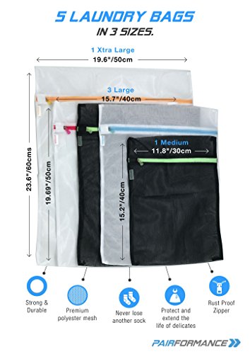 Studio : PAIRFORMACE LLC Publisher : PAIRFORMACE LLC Binding : Kitchen Product Description Mom and Dad laundry day washing and drying your kids clothes just became way easier. Dorm College students, travelers, businessmen and globe trotters will find endless uses for this set of Luxury Net Laundry Bags. in short EVERYONE! WHAT MAKES PAIRFORMANCE THE BEST LAUNDRY BAGS: - Black Mesh Bags will keep underwear and intimate clothe private. - Extra Large Bag will fit extra large items like delicate sweaters, pants, blouses, leggings, shoes and sneakers. - Colored Zippers make sorting and organizing way easier. - Extra Strong Zippers keep the bags closed even when in the washing machine - Fine extra soft mesh allows complete water flow for a trough rinse. - Polyester Fabric Material makes these extra durable, safe, and flame retardant. - Pack of five different sized laundry bags. - Multi purpose uses suitable for all kinds of household items - No rust zippers. MORE USES: - Washing Bag for washing reusable pads. - Black Mesh Bag for washing reusable sanitary pads, reusable pads and other intimate clothing. - Bathtub Toy bag. - Shower caddy for storing your toiletries. - Mesh Bag for Collecting sea shells at the beach. - All those pieces from your breast pump and baby bottles can be organized into the different sized bags. - Keep your socks together! - For hanging dishes to dry when Camping 0