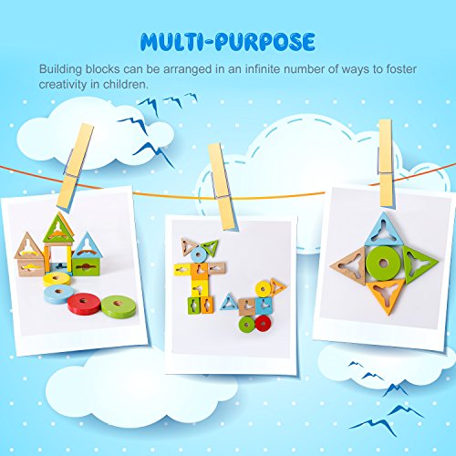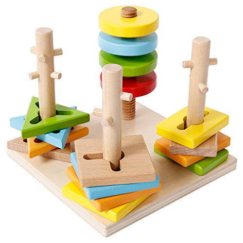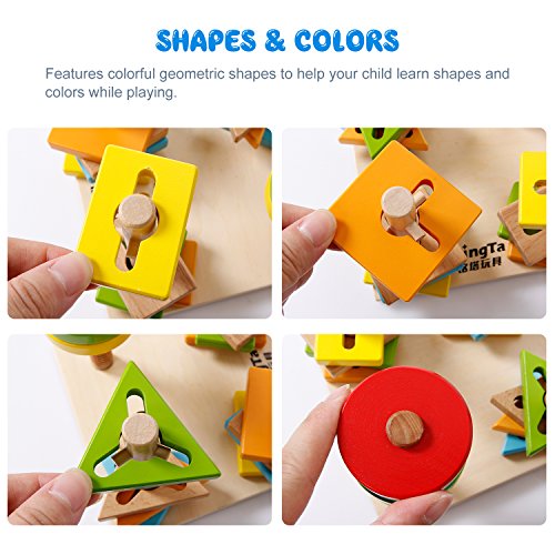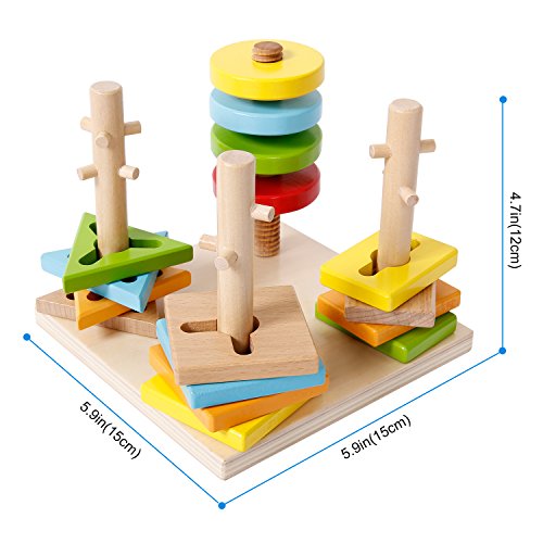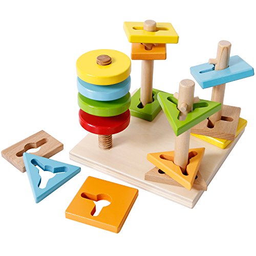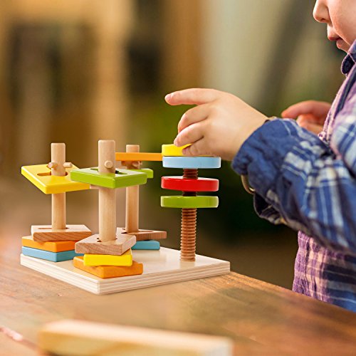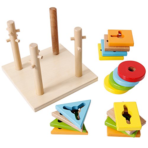 The sgile Shapes Geometric Sorting Stacking Block Toy teaches baby how to turn the right direction to take on and off the pegs by twisting and screwing