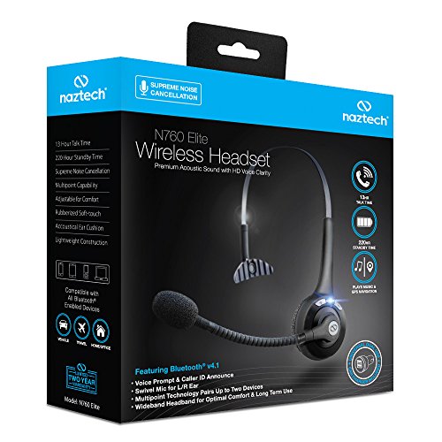-. Feature : A Trusted American Brand / UNIVERSAL COMPATIBILITY: works with all of your devices, including but not limited to iPhone 6 / 6s / 6 Plus / 6s Plus / 5 / 5s / 4 / 4s, LG, Sony, Blackberry, Samsung, HTC, Nokia, Trucker and any other Bluetooth enabled device including desktop computers and ultrabooks. / HD SOUND: the Naztech N760 provides the best acoustic sound quality and 2.4GHz transmission quality so you can hear your conversations, music, or turn-by-turn GPS directions with HD clarity! / BLUETOOTH WIRELESS: featuring Bluetooth CSR v.4.1, the Naztech N760 Elite Wireless Headset keeps your hands free to make phone calls when you're out and about a breeze. / MULTIPOINT AND MORE: the Naztech N760 Elite is capable of connecting to up to two devices at once so you can switch seamlessly between devices! It also provides call waiting, 3-way calling, voice activated dialing, mute, redial, and Google Voice / Siri Integration so it's easy to do anything on the road! / NOISE CANCELLING: this device has a noise cancelling microphone that allows for your voice to come through crisply and clearly without distracting ambient sound getting in the way. / EXTENDED BATTERY LIFE: the Naztech N760 works for up to 13 hours of continuous talk / music time and a staggering 220 hours on standby time! / ULTIMATE COMFORTABILITY: this headset features an adjustable wideband that conforms to any user and has incredibly comfortable ear cushions to provide you with a cloud-like fit.