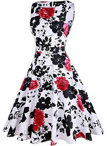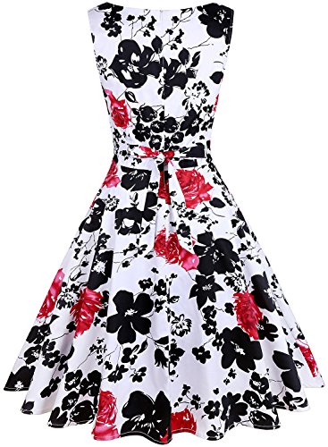 OTEN Women's Vintage Tea Dress Sleeveless Floral 1950s Cocktail Dressing, Medium, White+Red Floral