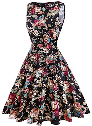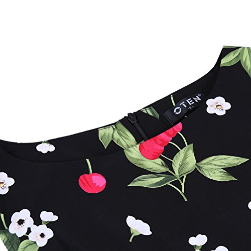 OTEN Women's Vintage Tea Dress Sleeveless Floral 1950s Cocktail Dressing, Medium, Black+Cherry