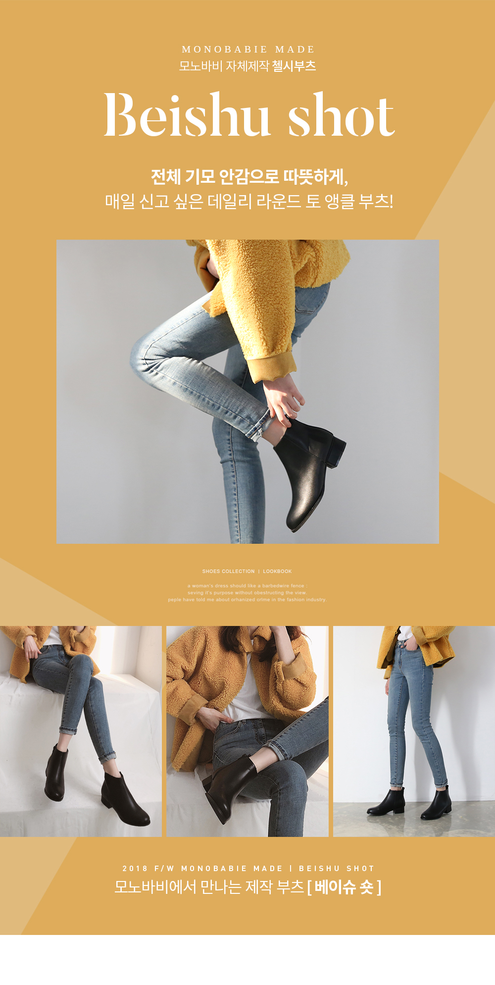 매일 신고 싶을만큼 스타일링이 쉬운 라운드 토 앵클 부츠입니다. 플랫한 높이의 앵클부츠는 트렌디 할 수도, 데일리 할 수도 있는 디자인으로 매일 신어도 질리지 않고 활용도 높은 제품입니다.