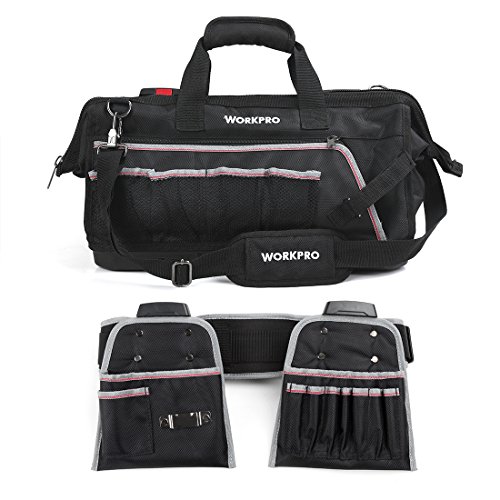 WORKPRO Tool Bag Heavy Duty 18-Inch with Molded Waterproof Bottom and 2 Tool Belt Pouches Combo Adjustable Shoulder Strap, Belt Included