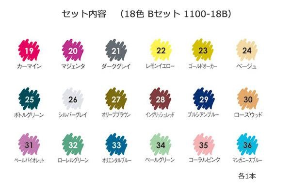 | セット内容 | カーマイン(19)、マジェンタ(20)、ダークグレイ(21)、レモンイエロー(22)、ゴールドオーカー(23)、ベージュ(24)、ボトルグリーン(25)、シルバーグレイ(26)、オリーブブラウン(27)、イングリッシュレッド(28)、プルシアンブルー(29)、ローズウッド(30)、ペールバイオレット(31)、ローレルグリーン(32)、オリエンタルブルー(33)、ペールグリーン(34)、コーラルピンク(35)、マンガニーズブルー(36) (各1本) |