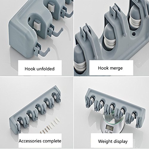 Broom Mop Rack Holder Wall Mounted Commercial Organizer Storage Rack 5 Position with 6 Hooks with Hooks ABS Plastic for Kitchen Garden Garage Laundry Offices