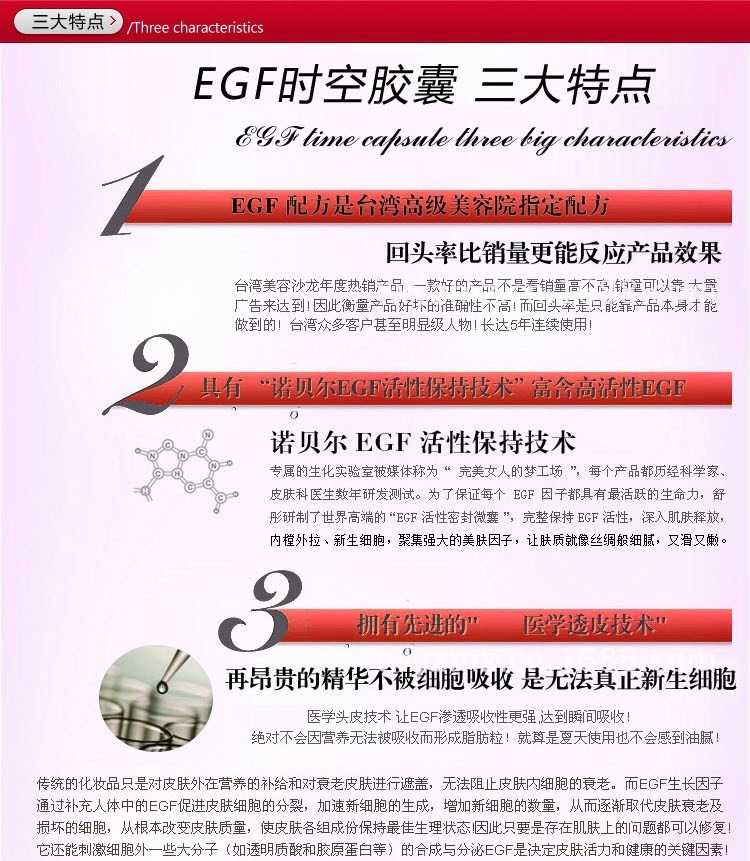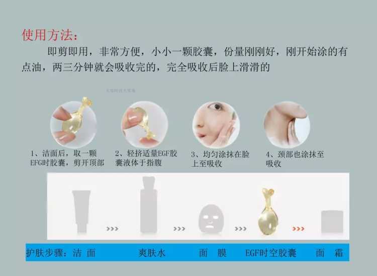 【EGF 时空胶囊】没有年龄性别限制,营养价值超越大牌精华液的修复效果,医疗机构的保养,带给你不一样的体验,再用膏乳霜就落伍了!具有淡化疤痕,红血丝,痘印,修复肌肤,缩收毛孔等功效。你只需要做好补水工作,然后用EGF时空胶囊就可以让你的肌肤提升N个级别,刚开始擦脸时比较油,但是不用担心油性肌肤不合适哦,吸收超快,不用两三分钟马上吸收。吸收后皮肤非常清爽呢,使用起来也方便,一颗搞定,不用麻烦的带各种护肤品,坚持一个月,皮肤真的变很细呢【主要功效】蕴含精纯EGF表皮细胞生长因子活性成分,完美促进肌肤表皮修复与再生。修复敏感,受损和老化的肌肤,促进胶原蛋白和弹力蛋白合成,使皮肤还原青春。有助于:祛痘、红血丝、痘印、收缩毛孔、淡化改善皱纹肌肤、补水修复、敏感肌肤、皮肤松弛、皮肤下垂、去皱纹效果。