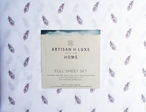 Sheet Set, Full Size Luxury 4 Piece, 100% Cotton, Deep Pockets, Bird Feathers Pattern Blue Pink on White, Artisan de Luxe Home
