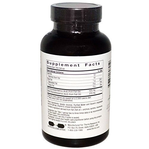 Studio : Thorne Research Publisher : Thorne Research Binding : Misc. Product Description Dietary Supplement NSF Certified for Sport Concentrated omega-3 fatty acids from cold-water fish Essential fatty acids help maintain healthy heart and brain function Helps maintain the body's normal inflammatory response in muscles and joints Promotes a healthy insulin response Helps maintain healthy levels of blood sugar and triglycerides Supports healthy neurological function 425 mg of EPA and 270 of mg DHA per softgel Molecular distillation removes heavy metals and other potential contaminants Supports mood and memory Omega-3 fatty acids are categorized as essential fatty acids because humans must get them from food or supplementation; i.e., they can't be made from other substances in the body. The essential omega-3 fatty acids from fish, EPA and DHA, are beneficial for the cardiovascular system. They support good circulation by promoting healthy blood vessels, enhancing blood flow by optimizing vascular endothelial function, and maintaining already normal triglyceride and cholesterol levels. Omega-3 fatty acids EPA and DHA are also supportive of healthy brain function. EPA and DHA are important throughout adulthood, as well as during periods of increased brain growth that characterize prenatal and postnatal development. Dietary supplementation with DHA and EPA has proven beneficial for a number of the known higher mental functions. Super EPA (an EPA/DHA-containing fish oil supplement) has been one of Thorne Research's best-selling products for over two decades because of its exceptional purity and quality. Recent technology has permitted an increase in the amount of EPA and DHA in each gelcap. This concentrated formula provides the amounts of EPA and DHA that recent research says is warranted, without having to take extra capsules. Super EPA provides the highest quality, purest fish oil available. Molecular distillation is utilized to ensure the removal of cholesterol and contaminants, including PCBs and heavy metals 0