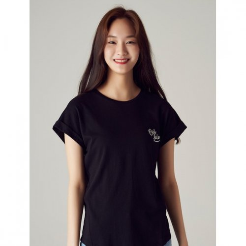 ● 턴업된 슬리브리스 디자인에 우븐 립 드로잉 디테일로 포인트를 준 티셔츠.