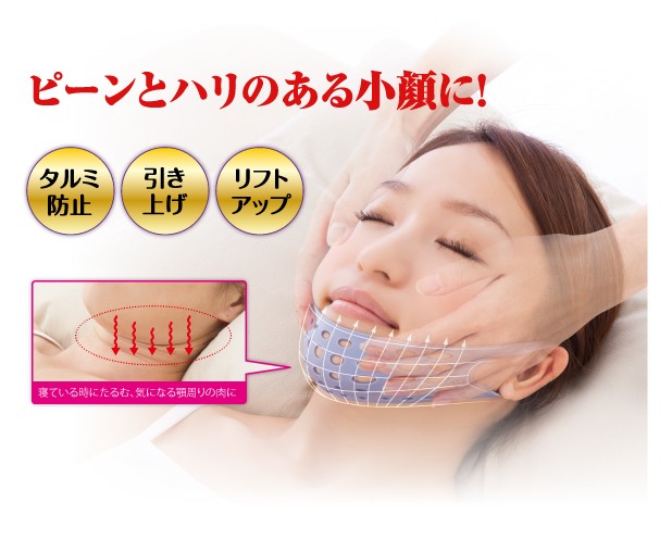 | 使用方法 | 洗顔後、お化粧を落とした状態でお使いください。 本体の上下をご確認ください。本体の緩やかに湾曲している方が下です。両端の耳穴に耳を引っ掛ける様に装着してください。 本体生地は伸縮性が高い素材です。耳元に違和感を感じられる場合は、ご自身のサイズに合うように引っ張って調整してください。 装着時にシワがよらないようにアゴからほほへと引き上げるようにご使用ください。 汚れが目立ちはじめたら水洗いし、直射日光の当たらない風通しの良い場所で乾かしてください。 |