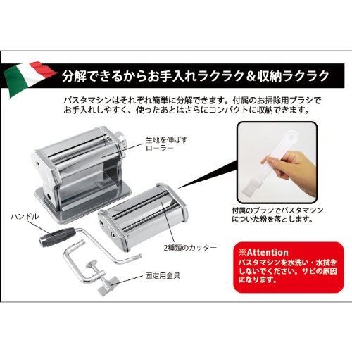 롤러,커터,핸들,고정용 금구가 간단하게 분해 할 수 있는 모아 두고, 수납 장소를 잡지 않아필요한 때 날렵하게 조립하고 쓸만한다※머신에 붙은 분이나 원단은,부속 브러시나 마른 천에 떨어뜨려 주십시오※녹의 원인이 되는 모아 두고, 세척 수 닦음은 하지 않아 내리 있어 파스타는 물론,우동도 만들 수 있다