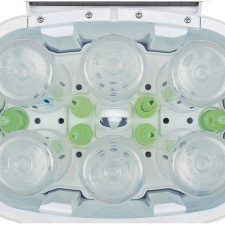 -. Feature : Safely steam sterilizes 6 bottles in 12 minutes for your convenience / Easy-to-use one-button operation / Removable basket holds bottles in position to steam directly inside each bottle / Accessory tray holds small items / Tongs included