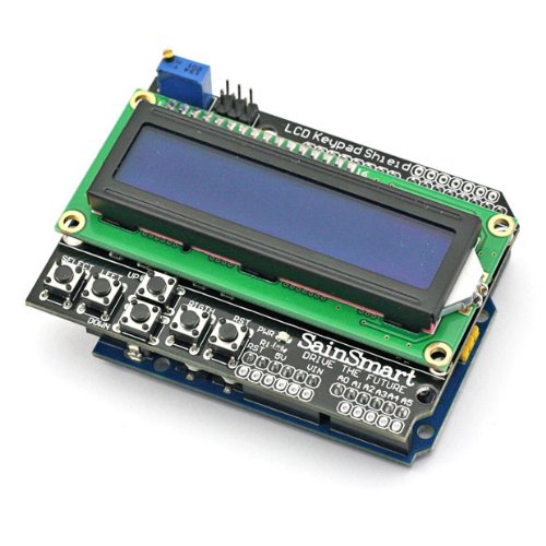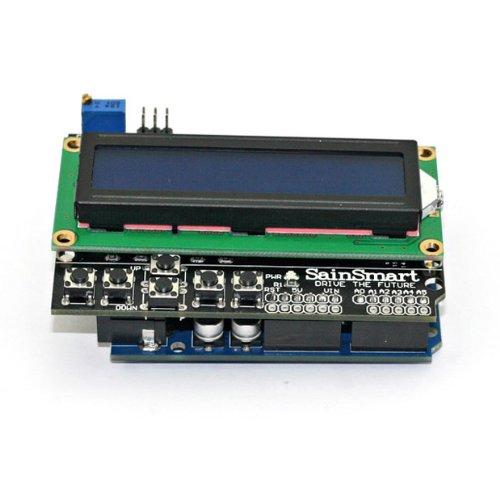 SainSmart LCD Keypad shield for Arduino: This SainSmart LCD Keypad Shield includes a 16x2 HD44780 White on Blue LCD module and a 5 push button keypad for menu selection and user interface programming. Fully assembled. On-line Arduino tutorial and example code. Compatible with Arduino Uno, Mega, Duemilanove. Uses digital pins 4 - 10, and analog pin 0.