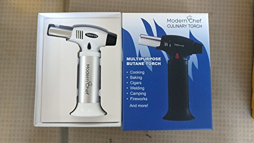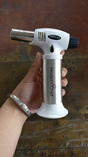 Modern Chef Butane Torch Refillable Cooking Kitchen Blow Torch WITH SAFETY LOCK & Adjustable Flame - For Pasteries Desserts Creme Brulee Brazing Soldering Camping Welding Cigars Fireworks (SILVER)